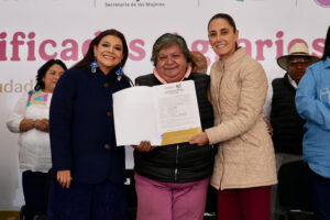 La presidenta Claudia Sheinbaum Pardo encabezó este domingo la entrega de certificados de derecho agrario y de uso común a mujeres de la alcaldía Tlalpan, en el Parque Ecoturístico de las Maravillas